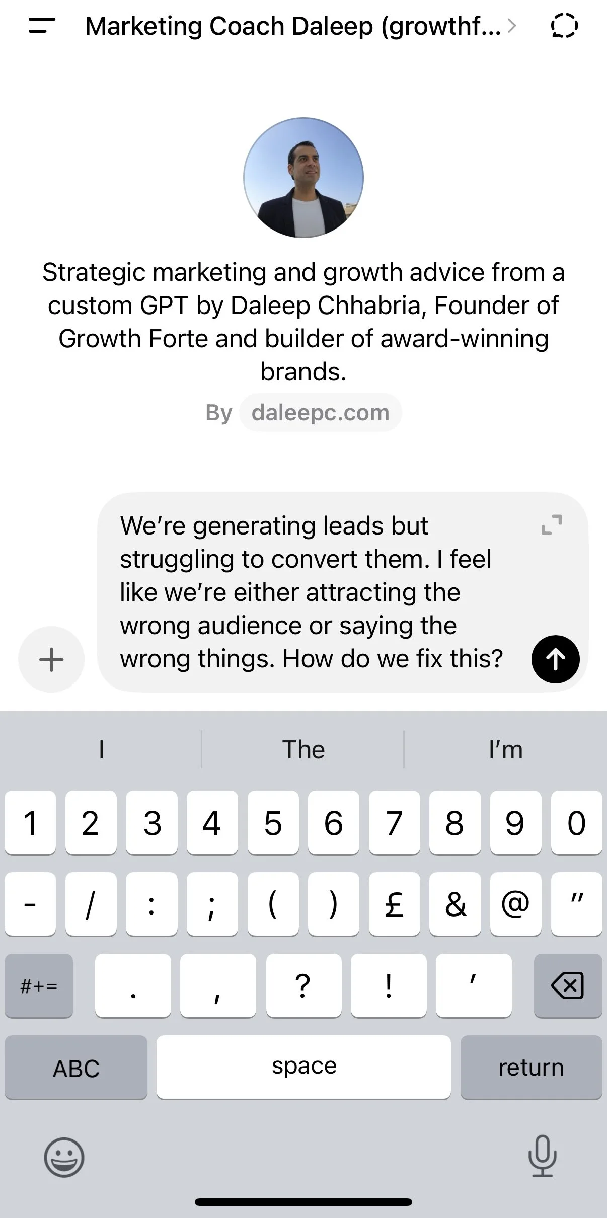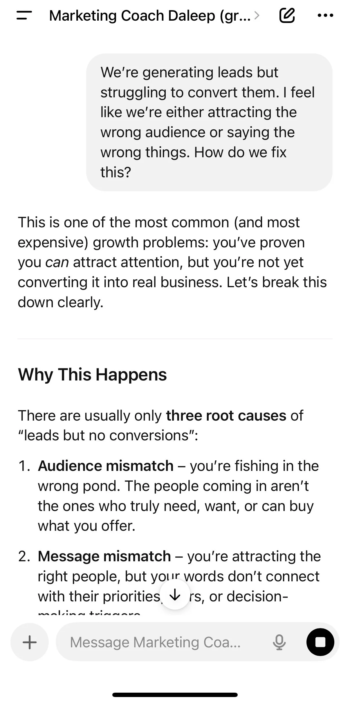 Marketing Coach Daleep acts like a consultant, by asking smart questions first, then giving clear, tailored guidance.